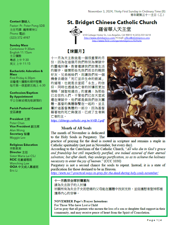 1) 十一月是煉靈月,特別為亡者祈禱。請各位教友填