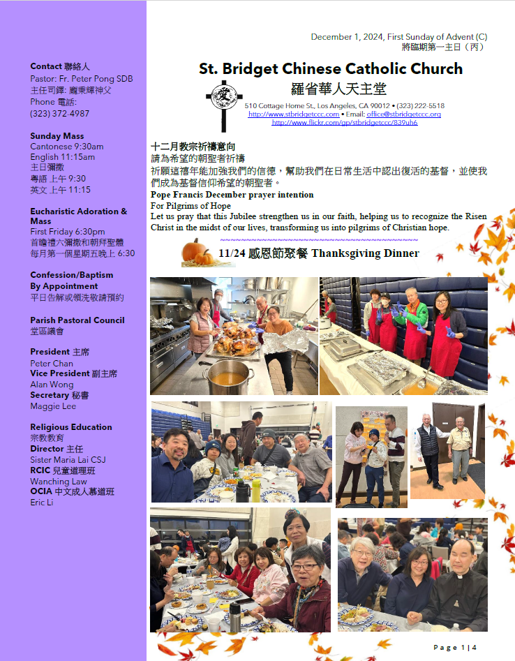4)The Solemnity of Immaculate Conception, a day of obligatory. The day of celebration will be moved to 12/9. Our SBCCC will celebrate the Mass at 7:30pm.