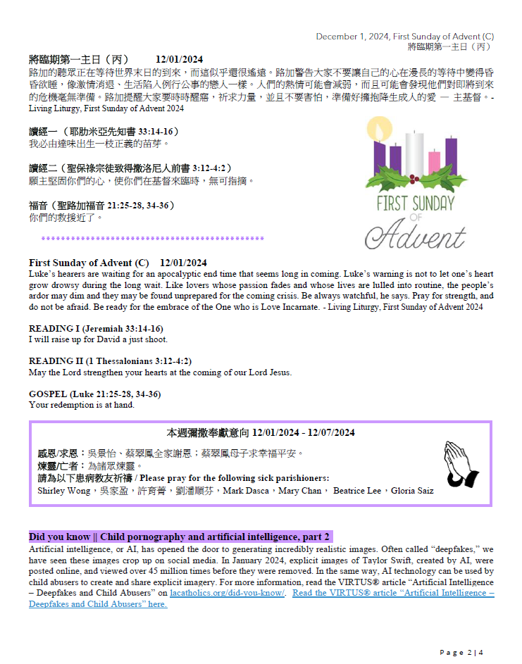 1)Arrangements for the Sacrament of Reconciliation, starting in December. 1st and 3rd Sundays of each month, 8:50- 9:20am, Chinese confession – Fr. Pong. 3rd Sundays of each month, 10:30-11:00am English Confession – Fr. Steven.