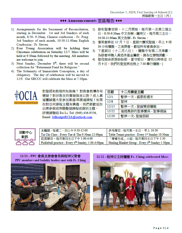 1)修和聖事安排,十二月開始:每月第一及第三個主日,8:50-9:20am中文告解 – 龐神父。每月第三主日,10:30-11:00am 英文告解 – Fr. Steven。