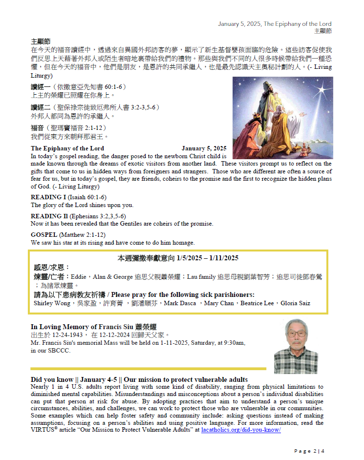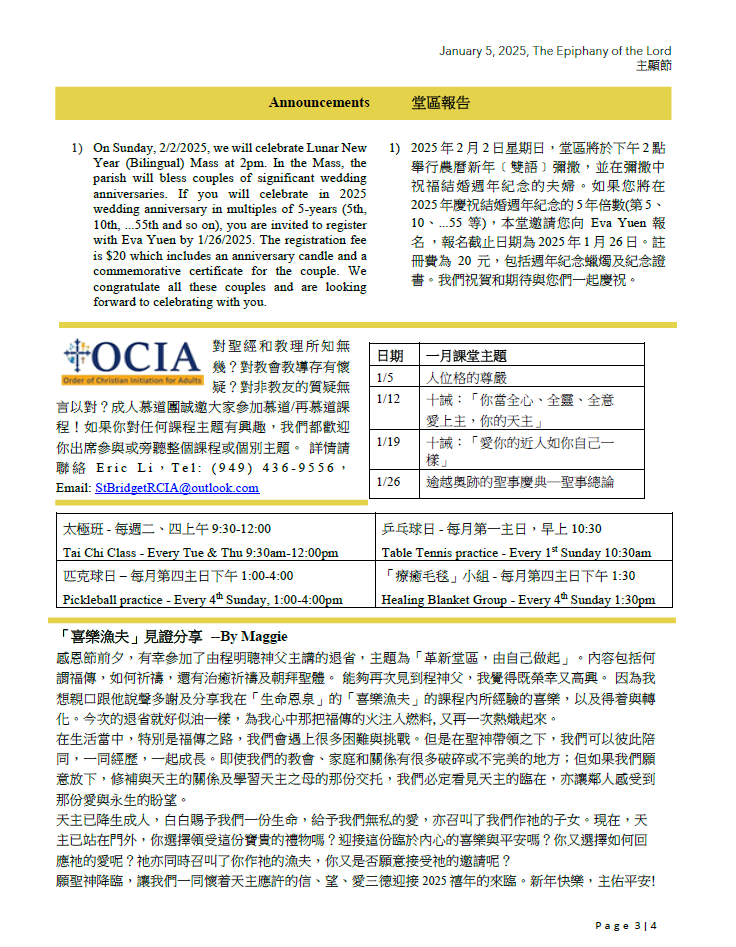 1)On Sunday, 2/2/2025, we will celebrate Lunar New Year (Bilingual) Mass at 2pm. In the Mass, the parish will bless couples of significant wedding anniversaries. If you will celebrate in 2025 wedding anniversary in multiples of 5-years (5th, 10th, …55th and so on), you are invited to register with Eva Yuen by 1/26/2025. The registration fee is $20 which includes an anniversary candle and a commemorative certificate for the couple. We congratulate all these couples and are looking forward to celebrating with you.