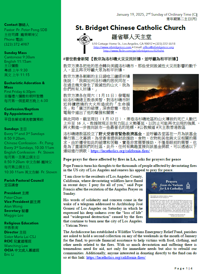 2)教友倘若想幫助洛杉磯縣近期火災中受影響的教堂和學校,堂區會繼續接受捐獻,所得款項將用於支持教區的野火受害者緊急救濟基金,請在支票或捐獻信封上註明便可。