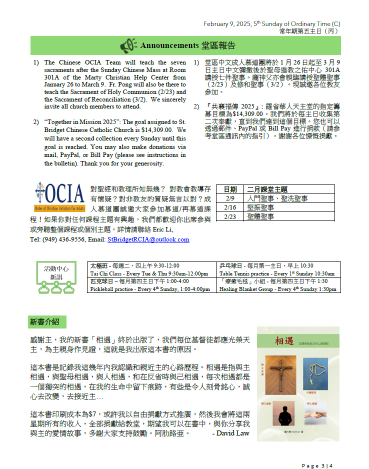 1) 堂區中文成人慕道團將於1 月26 日起至3 月9