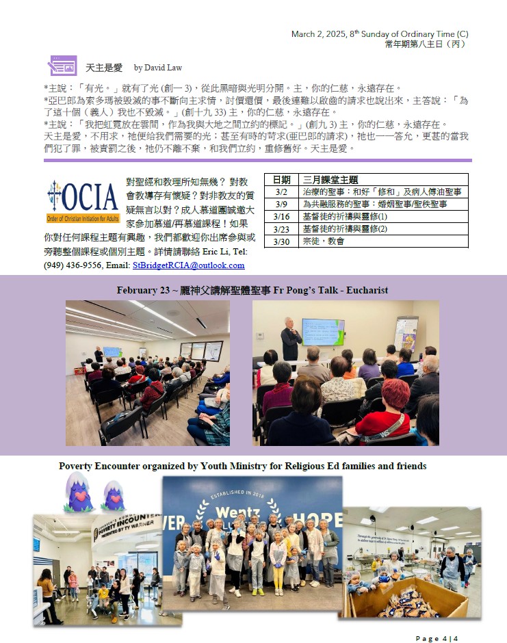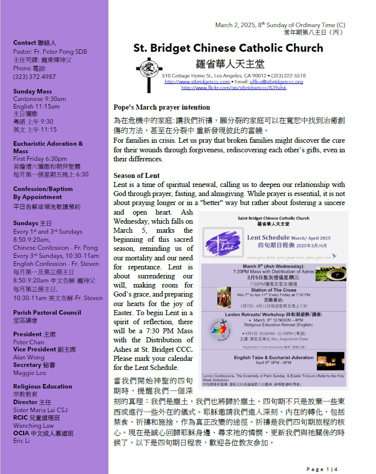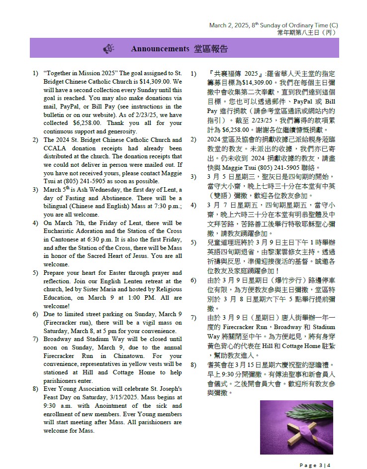 1)“Together in Mission 2025” The goal assigned to St. Bridget Chinese Catholic Church is $14,309.00. We will have a second collection every Sunday until this goal is reached. You may also make donations via mail, PayPal, or Bill Pay (see instructions in the bulletin or on our website). As of 2/23/25, we have collected $6,258.00. Thank you all for your continuous support and generosity.