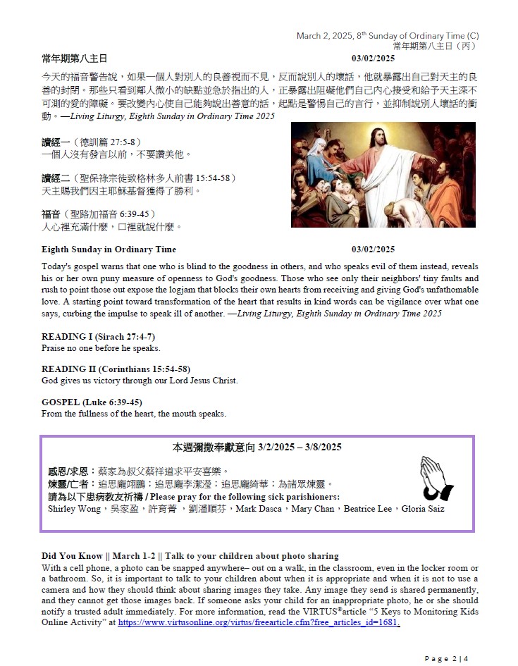 3)March 5th is Ash Wednesday, the first day of Lent, a day of Fasting and Abstinence. There will be a bilingual (Chinese and English) Mass at 7:30 p.m.; you are all welcome.