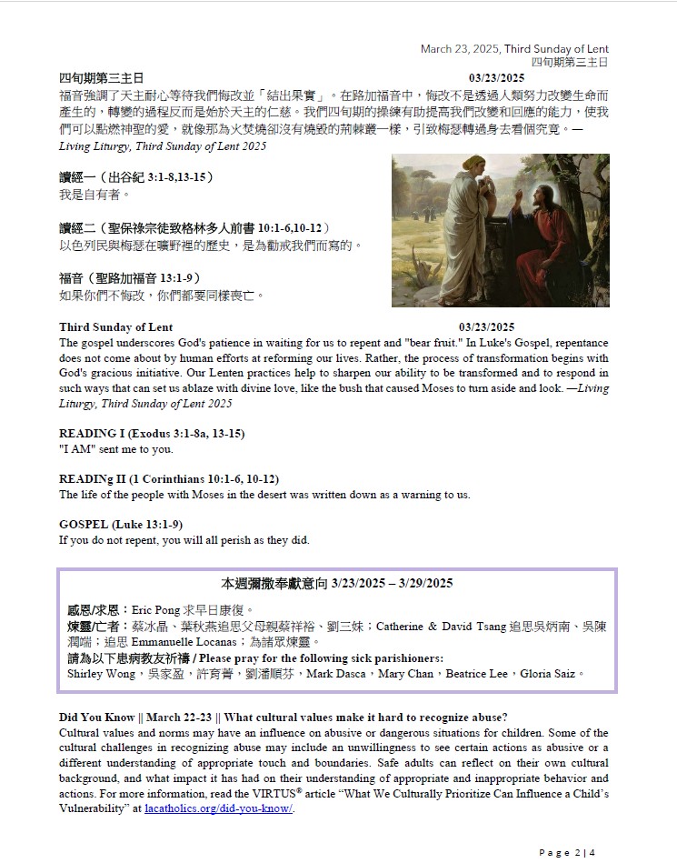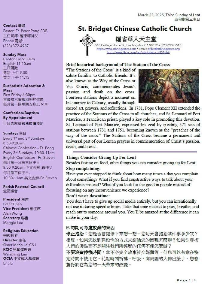 1)“Together in Mission 2025” The goal assigned to St. Bridget Chinese Catholic Church is $14,309.00. We will have a second collection every Sunday until this goal is reached. You may also donate via mail, PayPal, or Bill Pay (see instructions in the bulletin or our website). As of 3/16/25, we have collected $10,090.00. Thank you all for your continuous support and generosity.