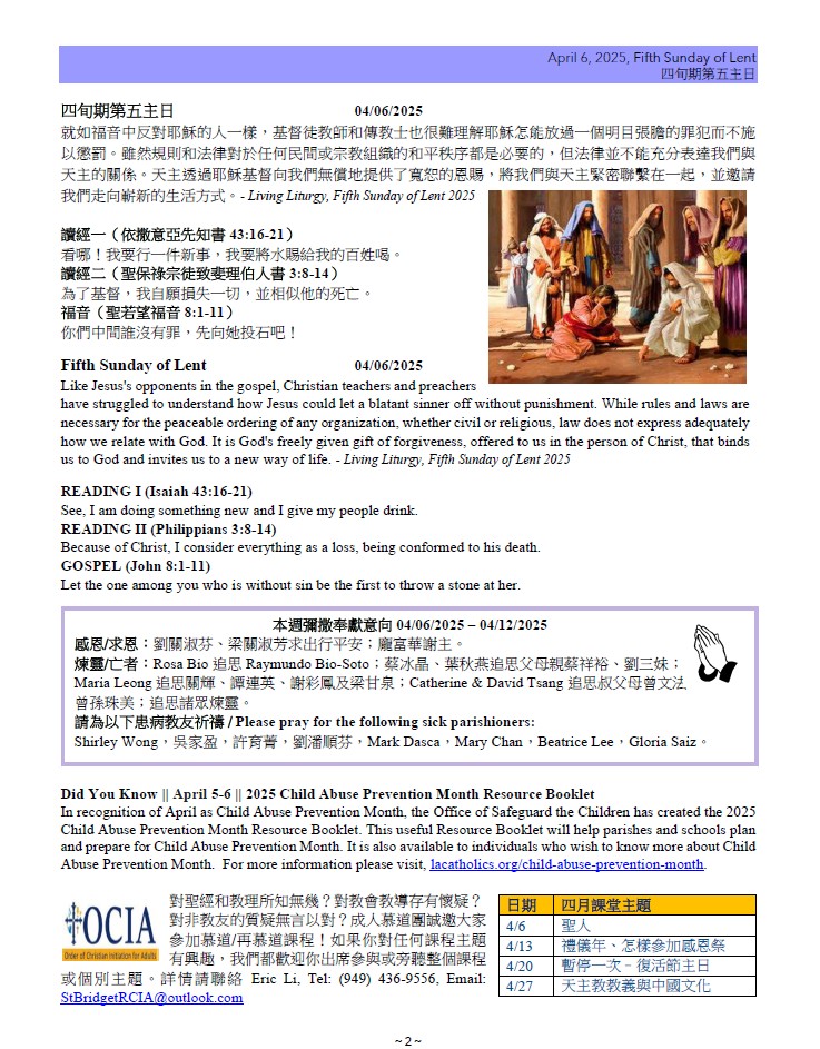 2)四月是全國防止虐待兒童月。洛杉磯總教區保護兒童辦事處為慶祝並提高個人的意識,把今年的主題定為「確保兒童今天、明天、及永久安全」。《2025–2026年共同努力防止兒童受性犯侵》小冊子現已推出。中英文版本已放在聖堂入口處和聖母進教之佑中心的保護兒童資訊架上。歡迎大家索取一份。謝謝。