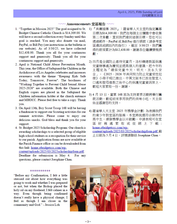 1.“Together in Mission 2025” The goal assigned to St. Bridget Chinese Catholic Church is $14,309.00. We will have a second collection every Sunday until this goal is reached. You may also donate via mail, PayPal, or Bill Pay (see instructions in the bulletin or our website). As of 3/30/25, we have collected $12,438.00. Thank you all for your continuous support and generosity. Thank you all for your continuous support and generosity.