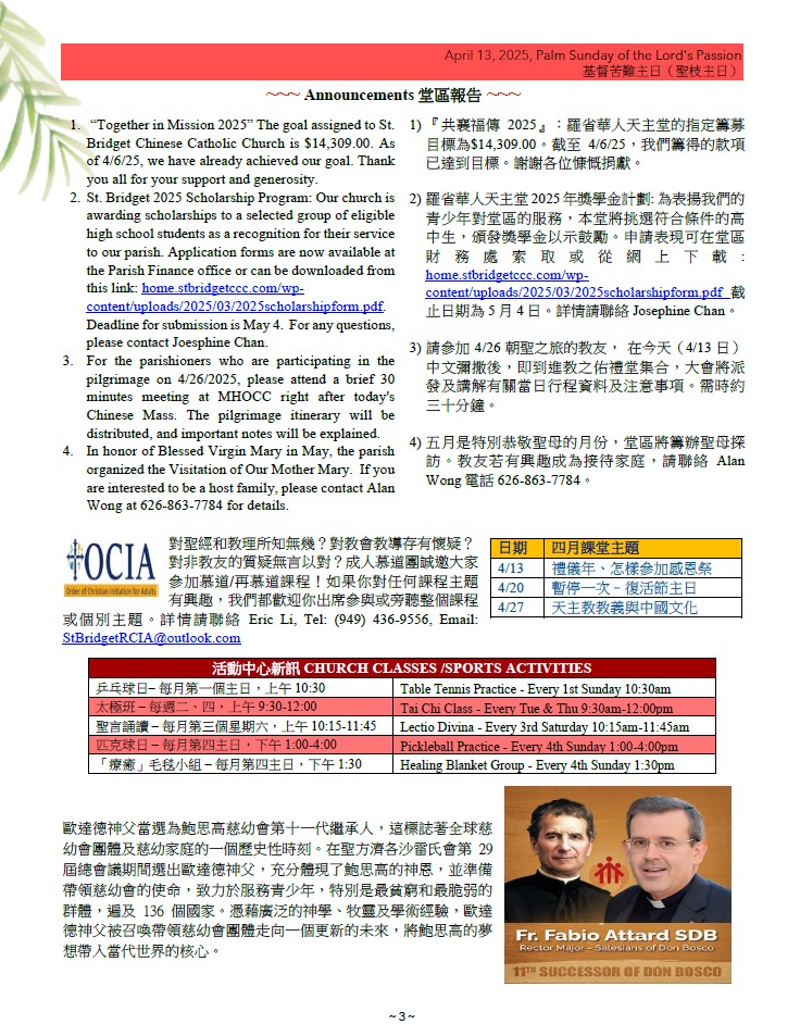 2)羅省華人天主堂2025年獎學金計劃: 為表揚我們的青少年對堂區的服務,本堂將挑選符合條件的高中生,頒發獎學金以示鼓勵。申請表現可在堂區財務處索取或從網上下載: home.stbridgetccc.com/wp-content/uploads/2025/03/2025scholarshipform.pdf截止日期為5月4日。詳情請聯絡Josephine Chan。