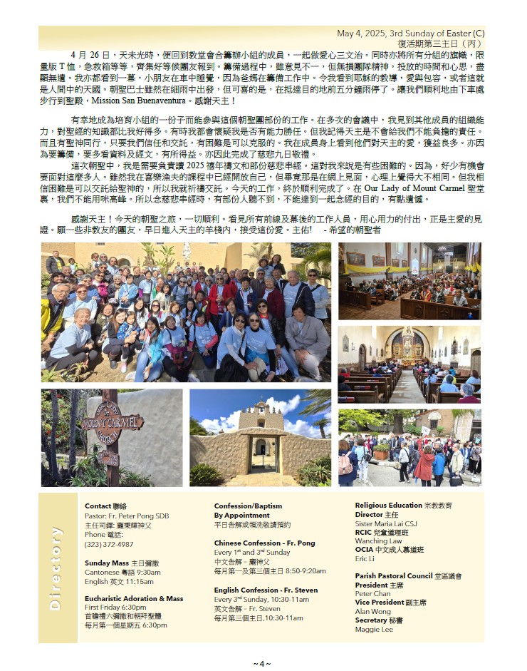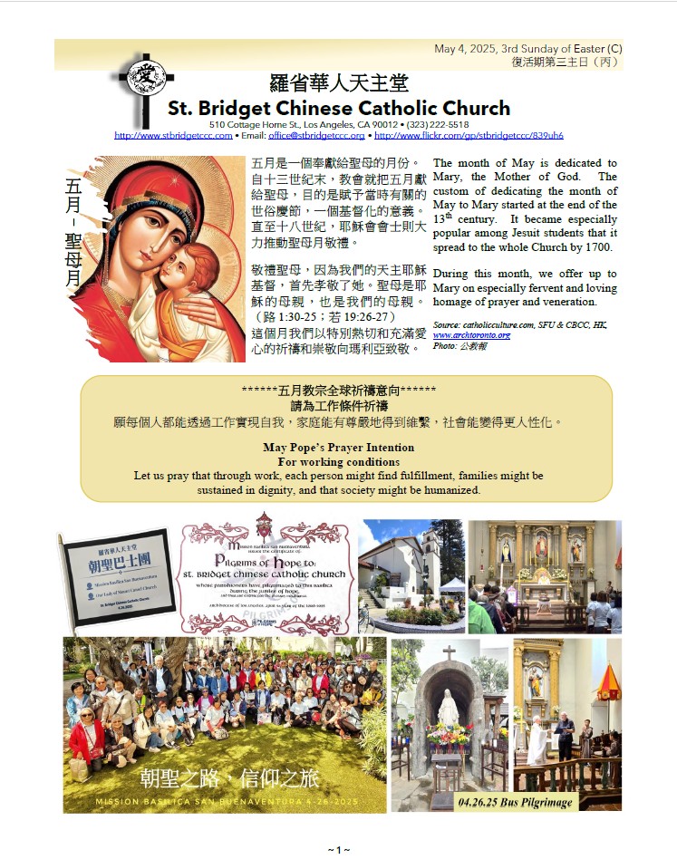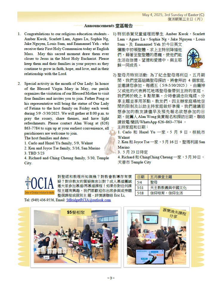2)聖母月特別活動: 為了紀念聖母瑪利亞,五月期間,我們堂區組織聖母探訪,將會拜訪4個家庭, 並邀請您參加。每週五(5/9-5/30/2025),由龐神父或他的代表將花地瑪聖母像帶到主持的家庭。我們將於晚上 8 點聚集,介時會誦念玫瑰經、分享主題並享用茶點。教友們,因主辦家庭場地空間的限制及以助主持家庭做好準備,我們建議若想參加的教友請儘早及預先報名欲想參加的日期。統籌人Alan Wong負責報名和探訪日期。聯絡請致電/簡訊/WhatsApp 626–863–7784 。