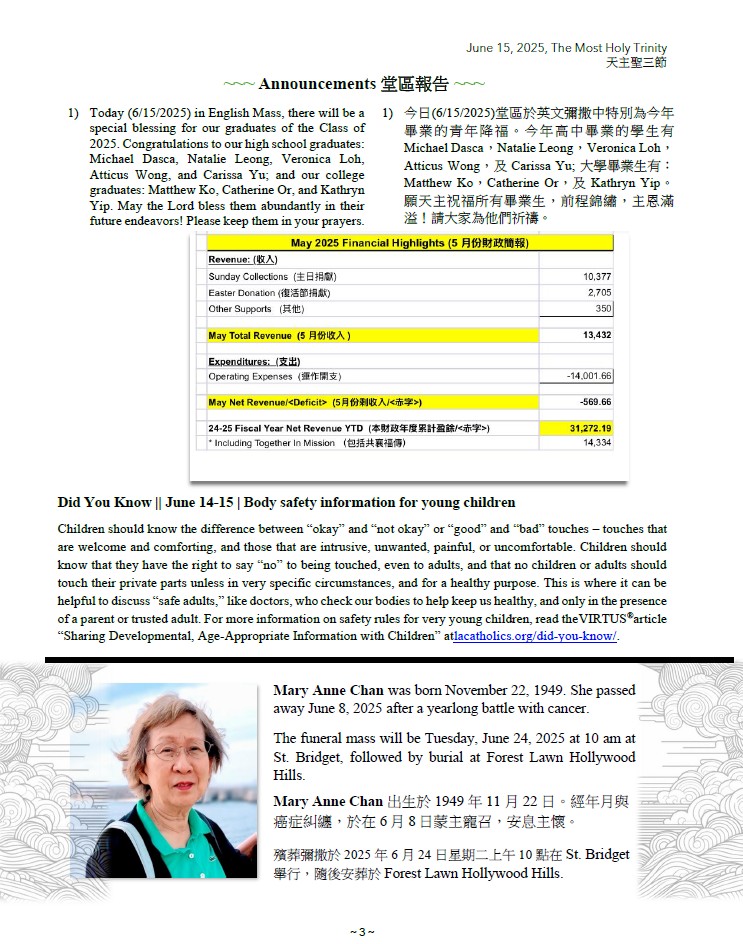 Today (6/15/2025) in English Mass, there will be a special blessing for our graduates of the Class of 2025. Congratulations to our high school graduates: Michael Dasca, Natalie Leong, Veronica Loh, Atticus Wong, and Carissa Yu; and our college graduates: Matthew Ko, Catherine Or, and Kathryn Yip. May the Lord bless them abundantly in their future endeavors! Please keep them in your prayers.