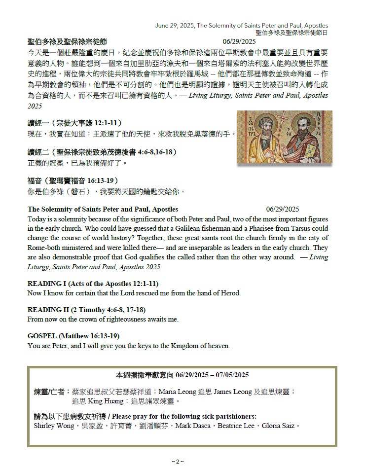 聖伯多祿及聖保祿宗徒節日 June 29, 2025, The Solemnity of Saints Peter and Paul, Apostles