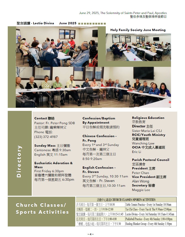 1) A faith formation seminar will be held on July 26 from 10:15 am to 12:30 pm. The theme is: Learning to “Listen” to the voice of the Lord in a changing world, deepening “I Believe”, and finding true “Hope”. The speaker is Sister Maria Teresa Hu, who is an Extraordinary Professor in Fu Jen Faculty of Theology of St. Robert Bellarmine in Taiwan. The seminar will be conducted in Mandarin, with Chinese/English PowerPoint presentations. No registration is required, and everyone is welcome to participate!