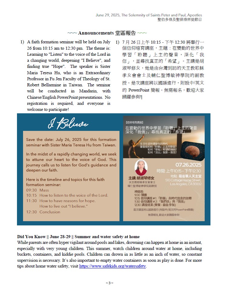 1) A faith formation seminar will be held on July 26 from 10:15 am to 12:30 pm. The theme is: Learning to “Listen” to the voice of the Lord in a changing world, deepening “I Believe”, and finding true “Hope”. The speaker is Sister Maria Teresa Hu, who is an Extraordinary Professor in Fu Jen Faculty of Theology of St. Robert Bellarmine in Taiwan. The seminar will be conducted in Mandarin, with Chinese/English PowerPoint presentations. No registration is required, and everyone is welcome to participate!
