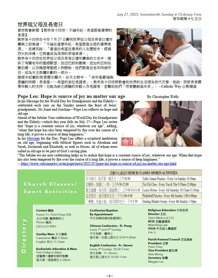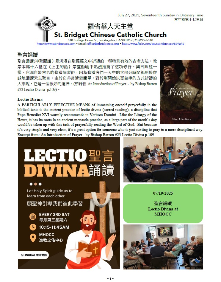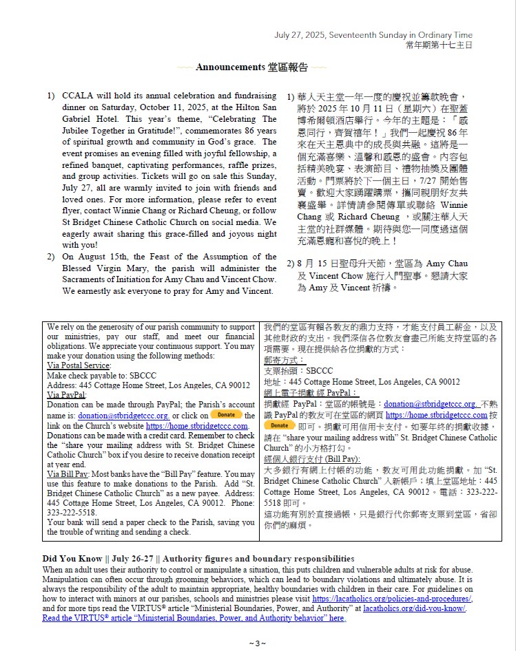1)CCALA will hold its annual celebration and fundraising dinner on Saturday, October 11, 2025, at the Hilton San Gabriel Hotel. This year’s theme, “Celebrating The Jubilee Together in Gratitude!”, commemorates 86 years of spiritual growth and community in God’s grace. The event promises an evening filled with joyful fellowship, a refined banquet, captivating performances, raffle prizes, and group activities. Tickets will go on sale this Sunday, July 27, all are warmly invited to join with friends and loved ones. For more information, please refer to event flyer, contact Winnie Chang or Richard Cheung, or follow St Bridget Chinese Catholic Church on social media. We eagerly await sharing this grace-filled and joyous night with you!