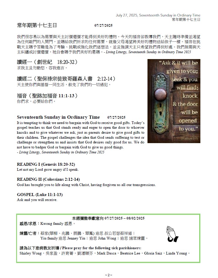常年期第十七主日 July 27, 2025, Seventeenth Sunday in Ordinary Time
