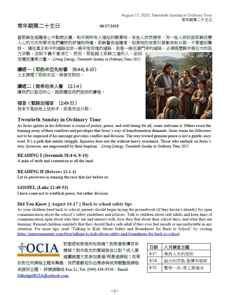 常年期第二十主日 August 17, 2025, Twentieth Sunday in Ordinary Time
