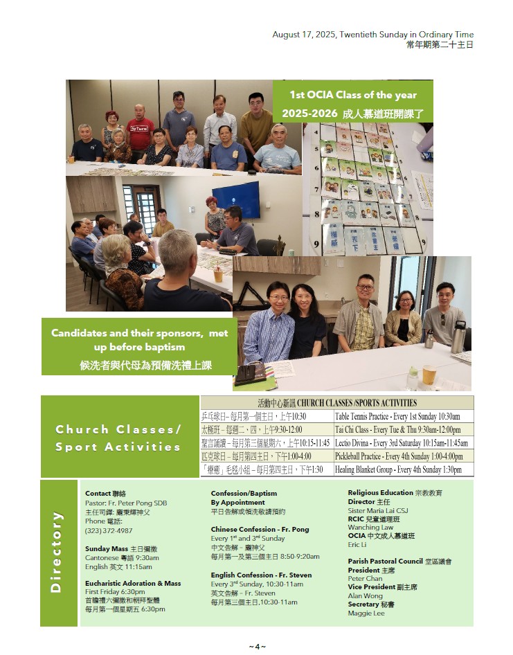 3)CCALA will hold its annual celebration and fundraising dinner on Saturday, October 11, 2025, at the Hilton San Gabriel Hotel. This year’s theme, “Celebrating The Jubilee Together in Gratitude!”, commemorates 86 years of spiritual growth and community in God’s grace. The event promises an evening filled with joyful fellowship, a refined banquet, captivating performances, raffle prizes, and group activities. Tickets is on sale. All are warmly invited to join with friends and loved ones. For more information, please refer to event flyer, contact Winnie Chang or Richard Cheung, or follow St Bridget Chinese Catholic Church on social media. We eagerly await sharing this grace-filled and joyous night with you!