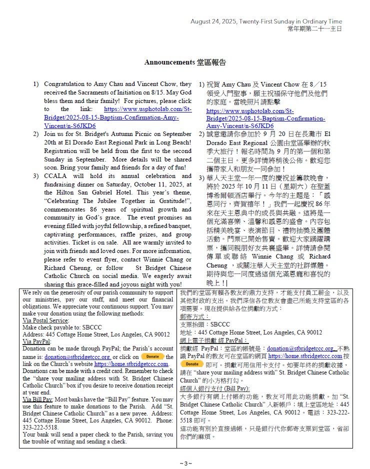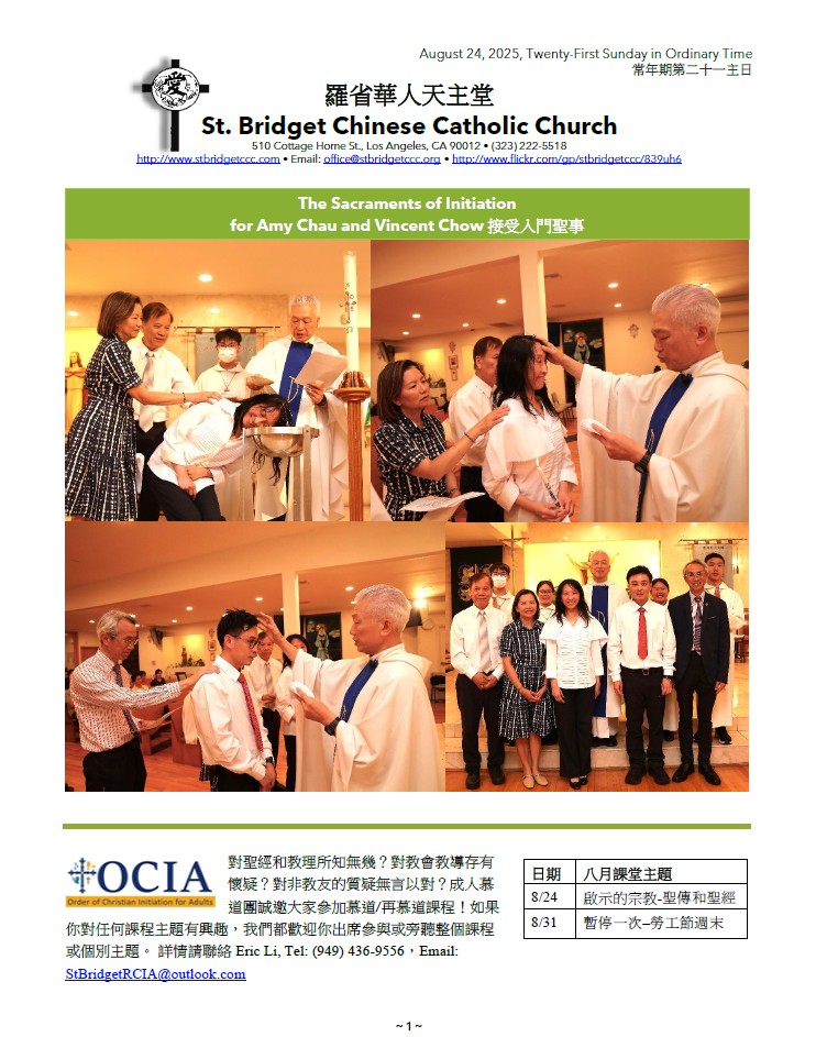 1)Congratulation to Amy Chau and Vincent Chow, they received the Sacraments of Initiation on 8/15. May God bless them and their family! For pictures, please click to the link: https://www.usphotolab.com/St-Bridget/2025-08-15-Baptism-Confirmation-Amy-Vincent/n-S6JKD6