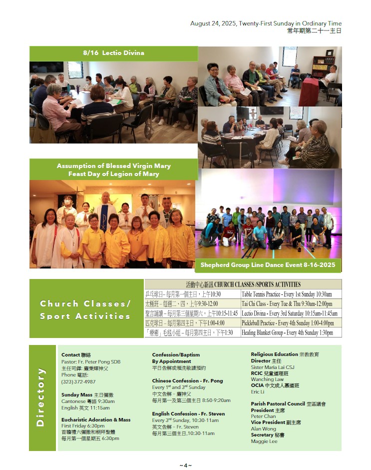 3)CCALA will hold its annual celebration and fundraising dinner on Saturday, October 11, 2025, at the Hilton San Gabriel Hotel. This year’s theme, “Celebrating The Jubilee Together in Gratitude!”, commemorates 86 years of spiritual growth and community in God’s grace. The event promises an evening filled with joyful fellowship, a refined banquet, captivating performances, raffle prizes, and group activities. Ticket is on sale. All are warmly invited to join with friends and loved ones. For more information, please refer to event flyer, contact Winnie Chang or Richard Cheung, or follow St Bridget Chinese Catholic Church on social media. We eagerly await sharing this grace-filled and joyous night with you!