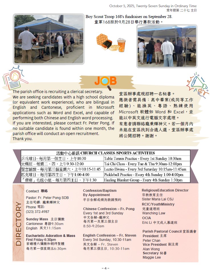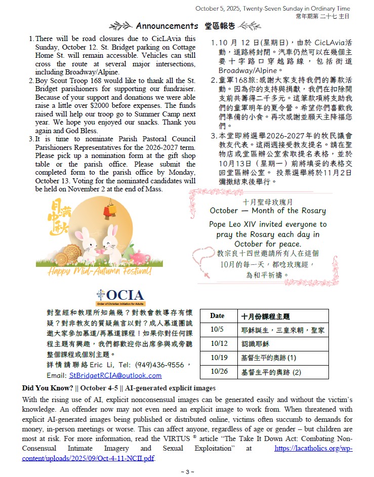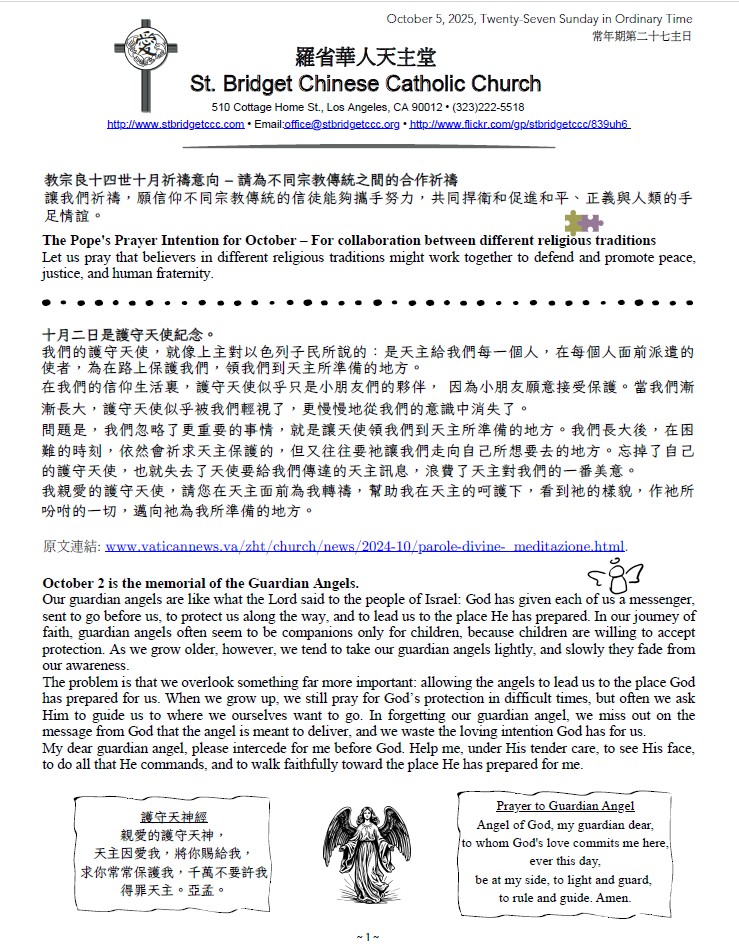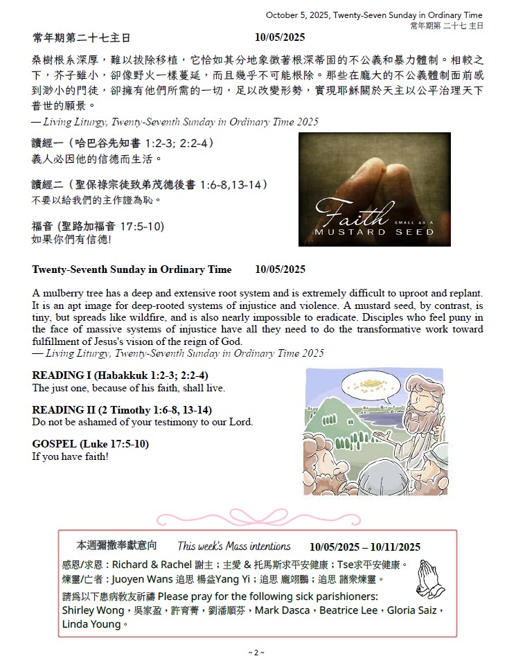 常年期第 二十七 主日 October 5, 2025, Twenty-Seven Sunday in Ordinary Time