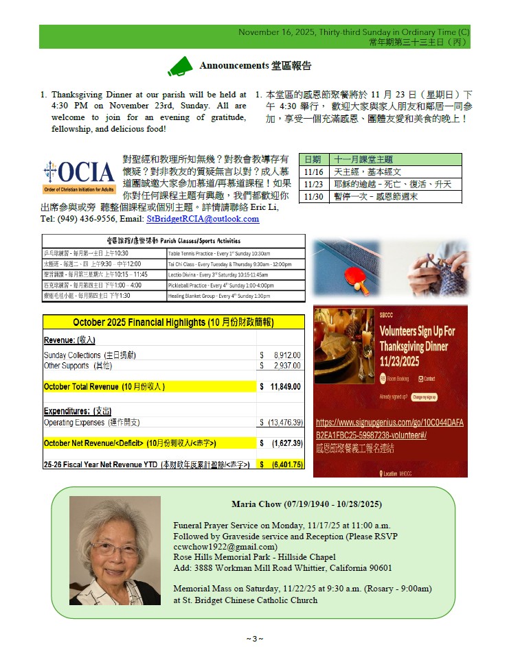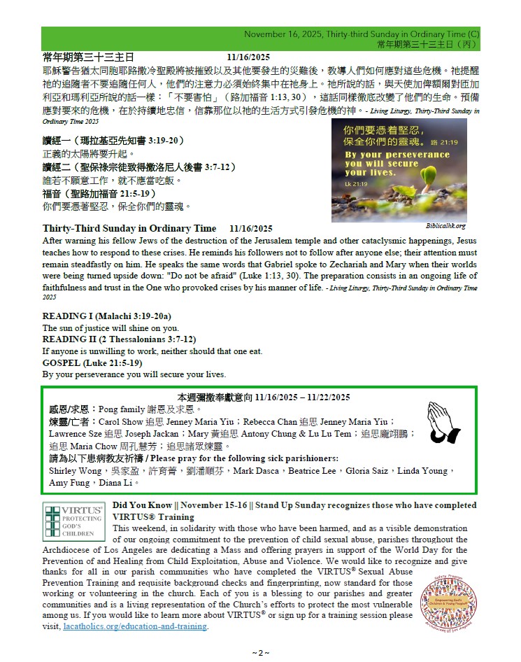 常年期第三十三主日(丙)November 16, 2025, Thirty-third Sunday in Ordinary Time (C)