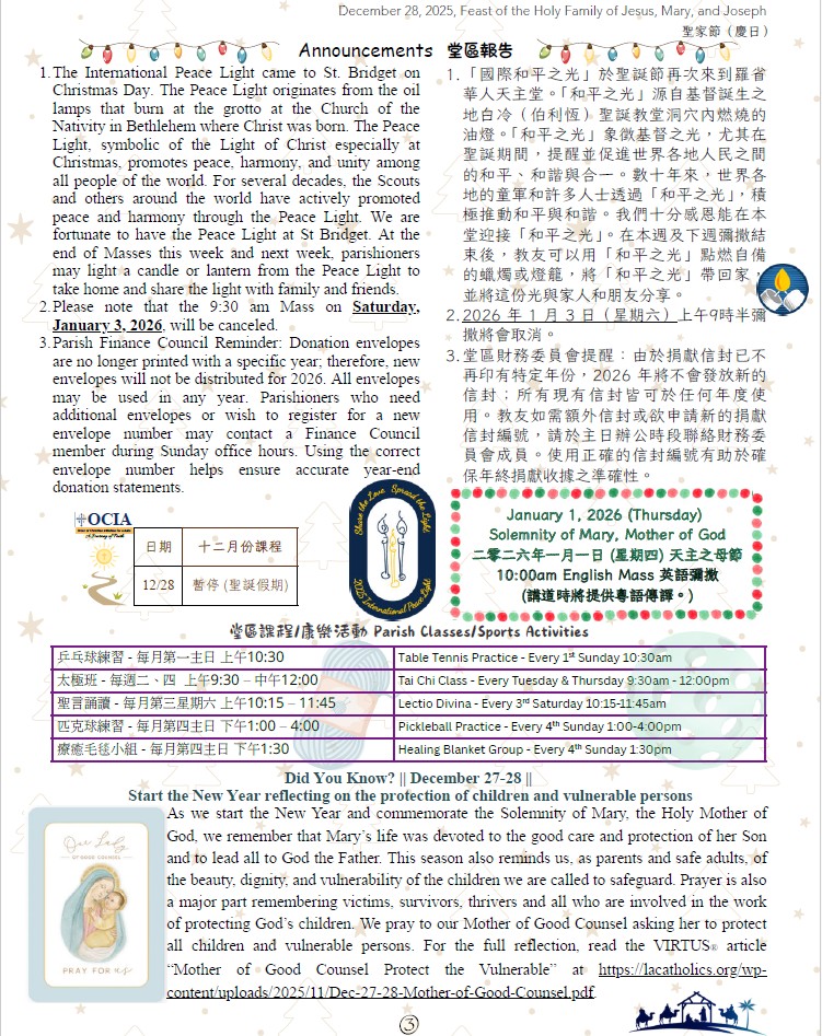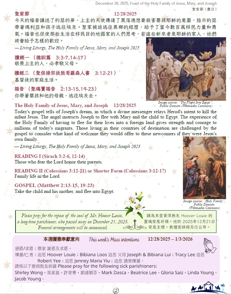 聖家節(慶日) December 28, 2025, Feast of the Holy Family of Jesus, Mary, and Joseph