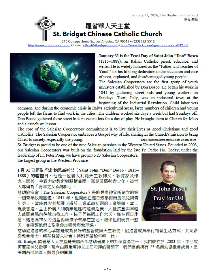 1)On 1/25, the Salesian Cooperators will celebrate the Feast of St. John Bosco at the Mary Help of Christians Center beginning at 10:30 am after the Chinese Mass. There will be performances, displays, snacks, and drinks. Please come early before the English Mass and enjoy the celebration with us. If you are interested in more information about Salesian Cooperators, please contact us.
