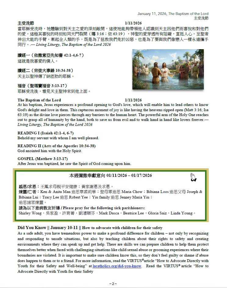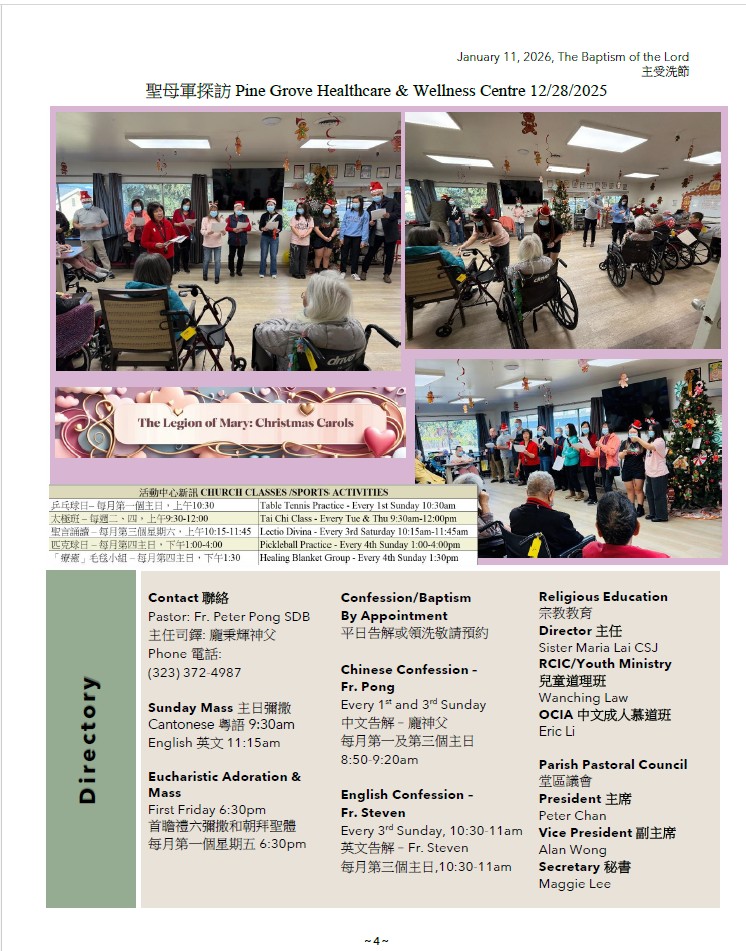 1)1月25日,慈幼協進會將在聖母進教之佑中心慶祝聖若望鮑思高瞻禮,活動將於早上10:30中文彌撒結束後開始。屆時將有表演、展覽、小吃和飲料。請在英文彌撒前提前到達,與我們一同慶祝。如果您想了解更多關於慈幼協進會的信息,請我們聯絡。