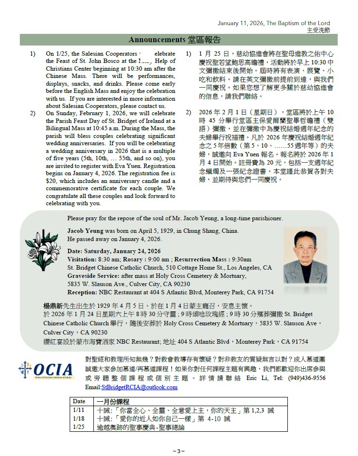 2)On Sunday, February 1, 2026, we will celebrate the Parish Feast Day of St. Bridget of Ireland at a Bilingual Mass at 10:45 a.m. During the Mass, the parish will bless couples celebrating significant wedding anniversaries. If you will be celebrating a wedding anniversary in 2026 that is a multiple of five years (5th, 10th, … 55th, and so on), you are invited to register with Eva Yuen. Registration begins on January 4, 2026. The registration fee is $20, which includes an anniversary candle and a commemorative certificate for each couple. We congratulate all these couples and look forward to celebrating with you.