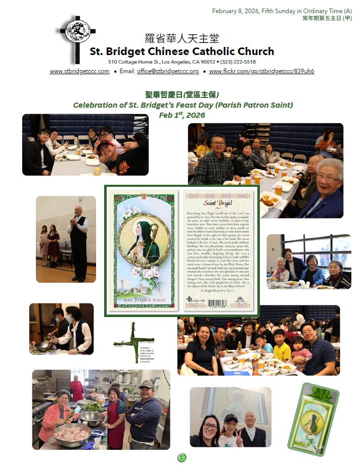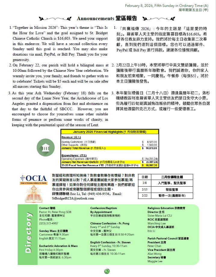 本主日彌撒後發售。 - 本年聖灰禮儀日(二月十八日)適逢農曆年初二,洛杉