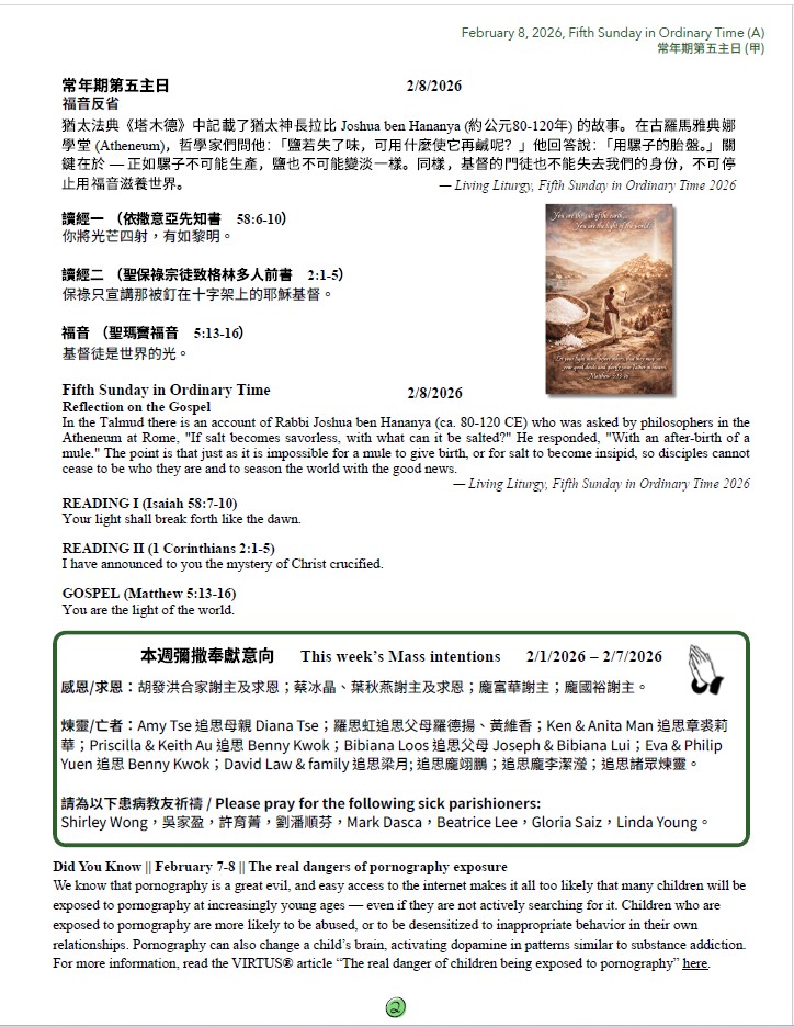常年期第五主日 (甲) February 8, 2026, Fifth Sunday in Ordinary Time (A)