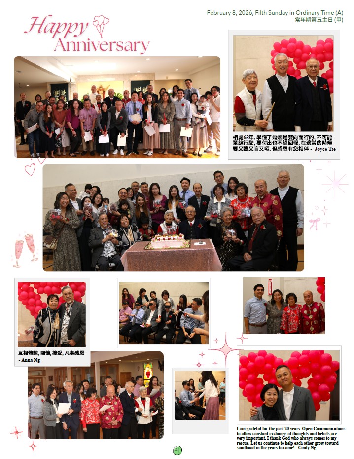 PayPal 或 Bill Pay 進行捐款。謝謝各位慷慨捐獻。 - 2月22日上午10時,本堂將舉行中英文雙語彌撒,並於