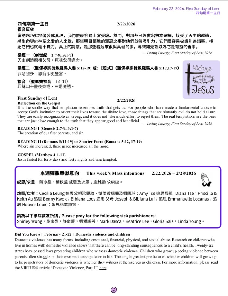 四旬期第一主日 February 22, 2026, First Sunday of Lent