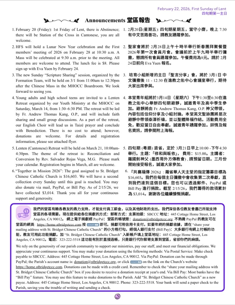 5. “Together in Mission 2026”: The goal assigned to St. Bridget Chinese Catholic Church is $16,603. We will have a second collection every Sunday until this goal is reached. You may also donate via mail, PayPal, or Bill Pay. As of 2/15/26, we have collected $3,014. Thank you all for your continuous support and generosity.