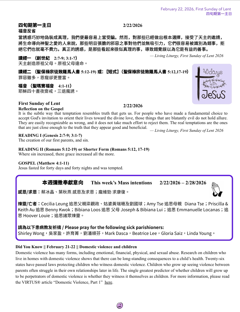 2.The new Sunday “Scripture Sharing” session, organized by the Formation Team, will be held on 3/1 from 11:00am to 12:30pm after the Chinese Mass in the MHOCC Boardroom. We look forward to seeing you.