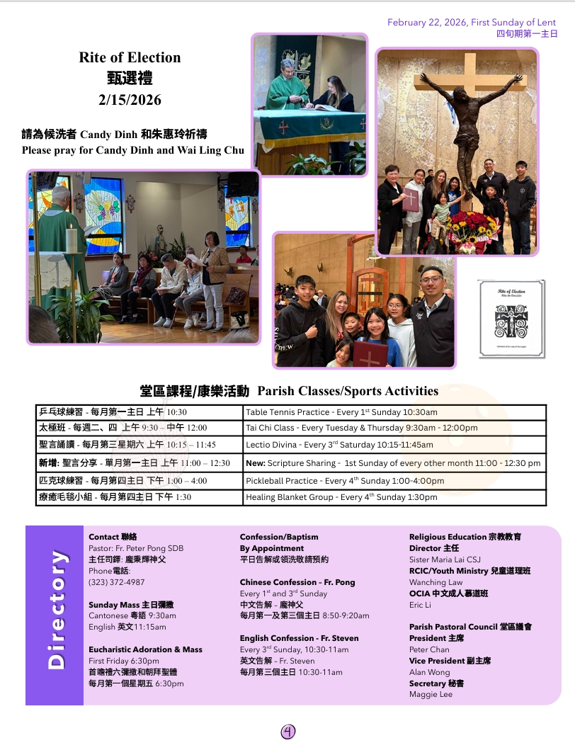 5. “Together in Mission 2026”: The goal assigned to St. Bridget Chinese Catholic Church is $16,603. We will have a second collection every Sunday until this goal is reached. You may also donate via mail, PayPal, or Bill Pay. As of 2/15/26, we have collected $3,014. Thank you all for your continuous support and generosity.