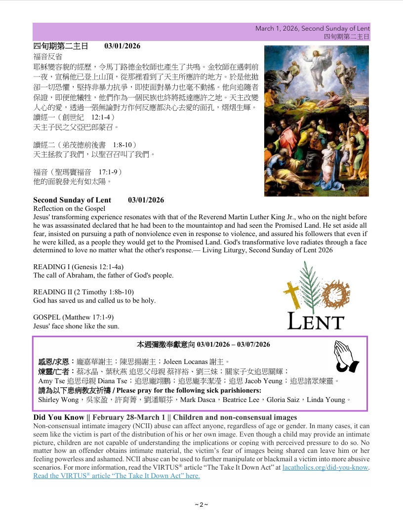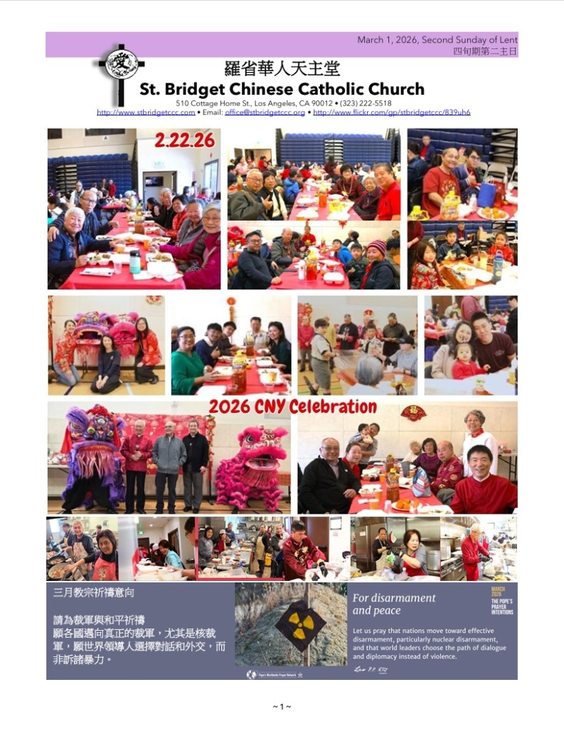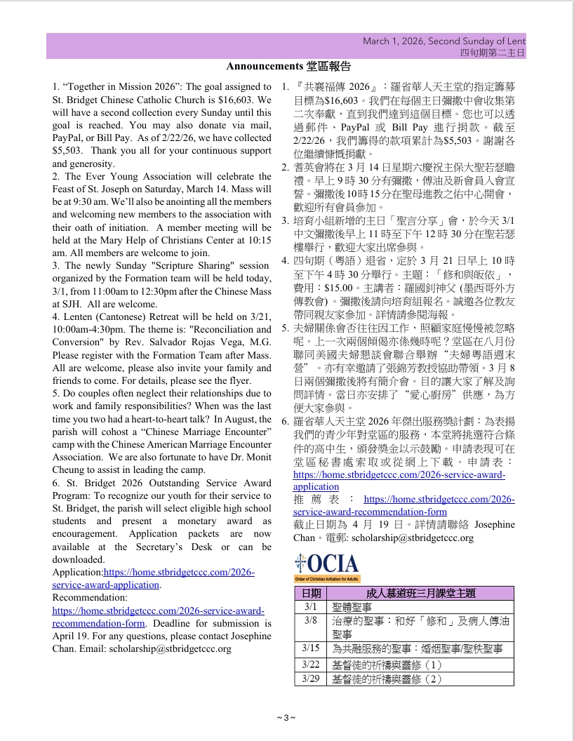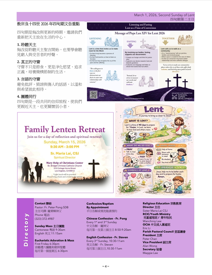 at SJH. All are welcome. - Lenten (Cantonese) Retreat will be held on 3/21,