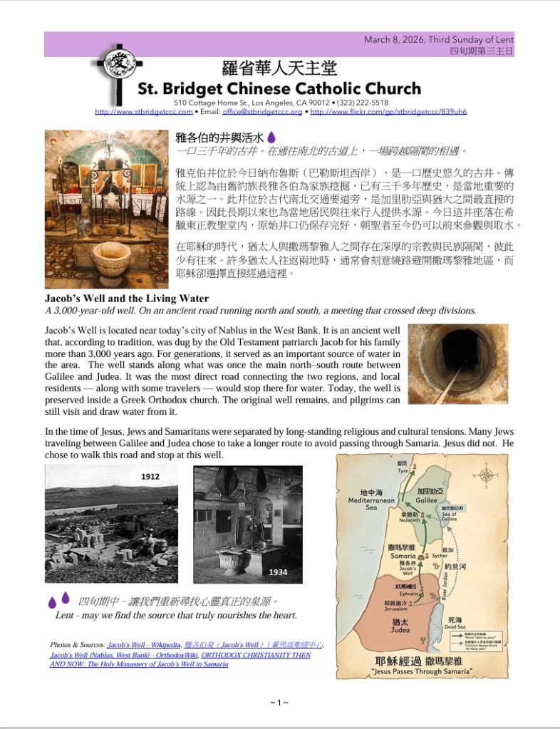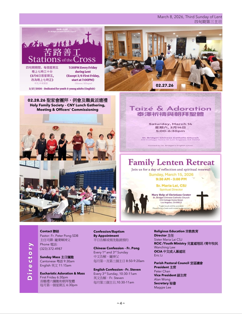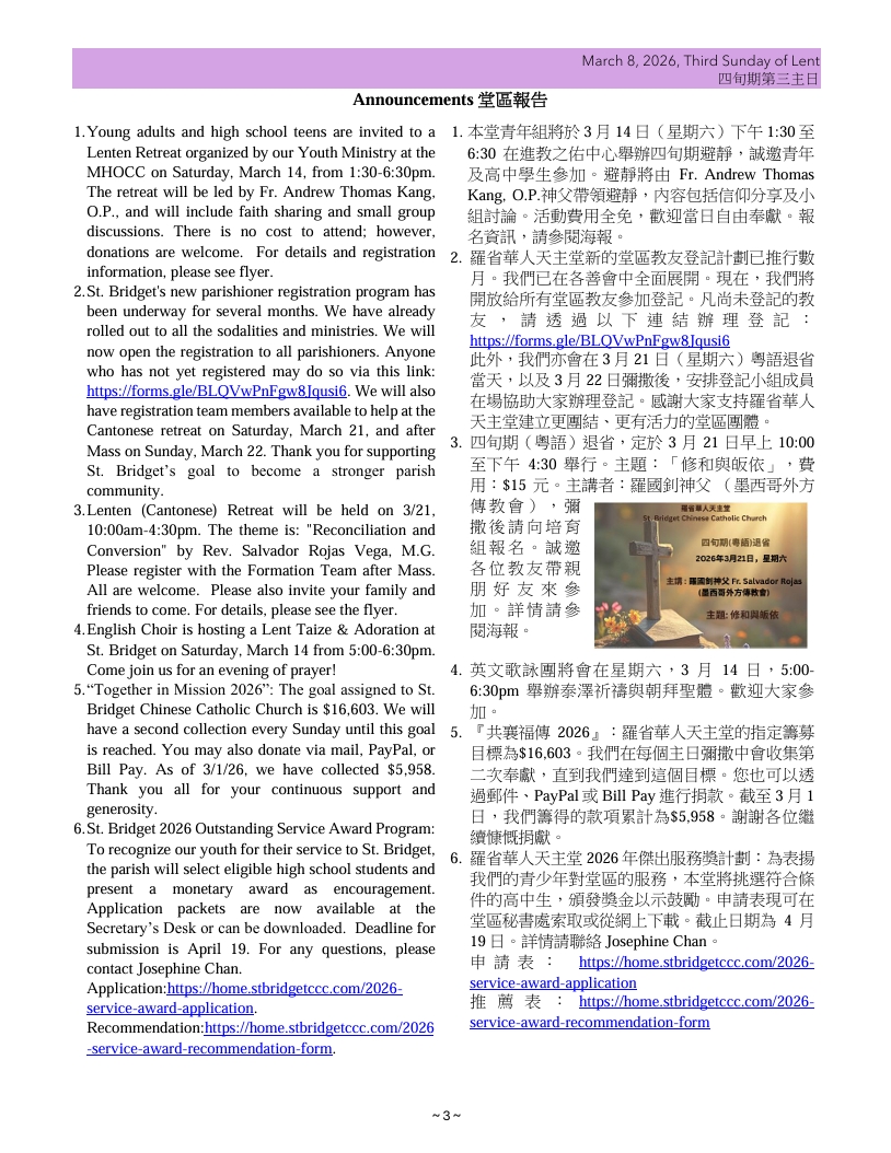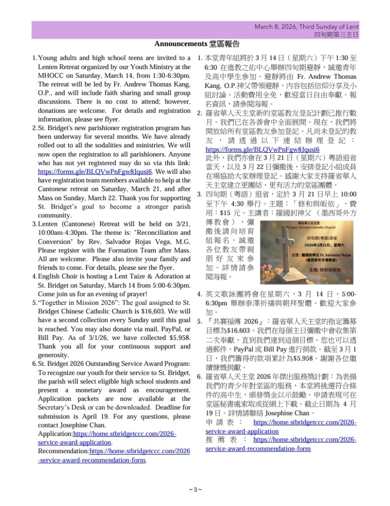 - “Together in Mission 2026”: The goal assigned to St. Bridget Chinese Catholic Church is $16,603. We will have a second collection every Sunday until this goal is reached. You may also donate via mail, PayPal, or Bill Pay. As of 3/1/26, we have collected $5,958.