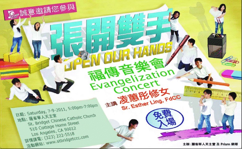 You are invited to an evening of great music performance by Prism and an inspirational talk by Sr. Esther Ling, f.d.c.c. on July 9, 2011 at 5:00 p.m. at the St. Bridget Chinese Catholic Church.